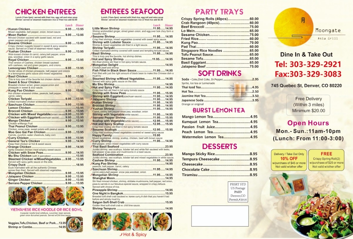 For dessert, the Mango Sticky Rice and Tempura Cheesecake are deliciously indulgent choices. Complementing the meal, the drinks menu features a variety of refreshing options such as Vietnamese Iced Coffee and Peach Yogurt Smoothie. With its wide range of flavors and choices, Moon Gate Asian Grill offers a fulfilling dining experience that caters to all tastes.